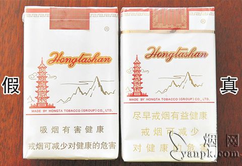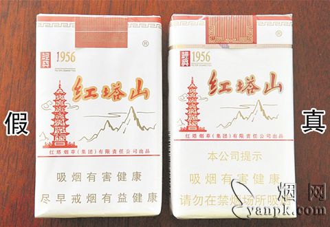 商标纸背面印刷工艺差异对比:真烟红塔上部的拼音凹凸明显,烫金轮廓线套印准确;假烟烫金轮廓线套印偏差较大。