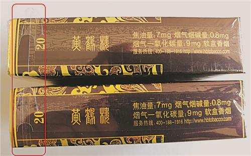 真烟商标纸采用铜版纸,胶印印刷,红色方框内金色图案离中间竖线较远且金色图案上没有竖线,封签上的拼音“HUANGHELOU”笔画较粗;假烟采用高清扫描仿制印刷,红色方框内金色图案离中间竖线较近且金色图案上均有竖线,封签上的拼音“HUANGHELOU”笔画较细。
