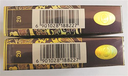 真 假 商标纸印刷工艺差异对比:真烟商标纸采用铜版纸,胶印印刷,红色方框内金色图案离中间竖线较远且金色图案上没有竖线,封签上的拼音“HUANGHELOU”笔画较粗;假烟采用高清扫描仿制印刷,红色方框内金色图案离中间竖线较近且金色图案上均有竖线,封签上的拼音“HUANGHELOU”笔画较细。