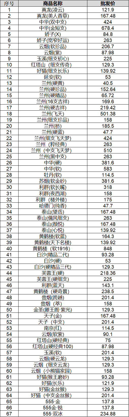 白银市烟草公司2022年10月部分品牌批发价