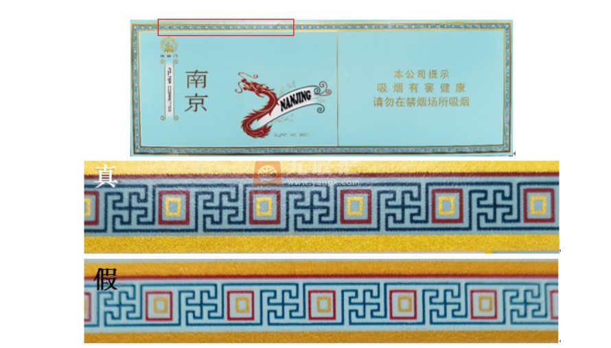 1.南京(炫赫门)条盒商标:真烟金色方框处于红色方框内居中位置,真烟红框线条较粗;假烟金色方框有明显位置偏差不居中,且假烟红框线条较细。