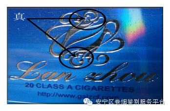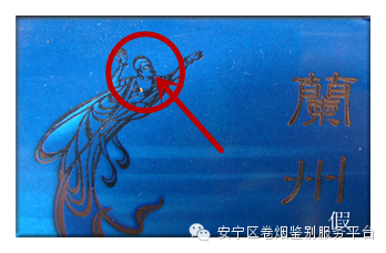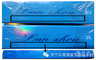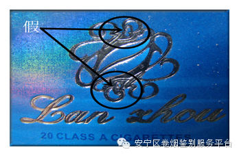真品硬蓝“兰州”小盒正面飞天面部五官清晰烫金流畅。假烟飞天面部五官模糊。真品小盒背面厂标图案清晰,假烟小盒背面厂标图案模糊。