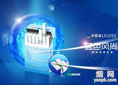 这款“中南海(蓝色风尚)”具有四大产品亮点,分别为“纳米三元复合滤嘴”、“环保全麻网纹盘纸”、“添加中草药精华素”以及“采用独特配方技术”。