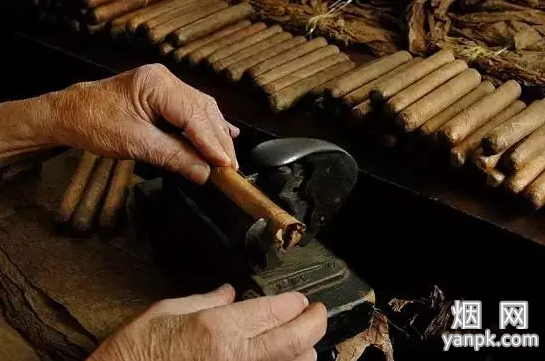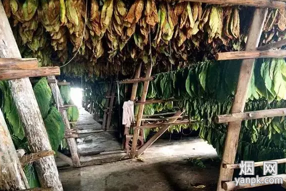 采摘下来的烟叶按照大小和质地分类后,经过手工捆扎,送到烟田边上的仓库里。在那里,新鲜的烟叶挂在烟杆上,在避光、通风的条件下晾晒。根据烟叶品种不同,晾晒时间从3周至8周不等。在此期间,烟叶的大部分水分蒸发,颜色逐渐由绿色变成黄色,进而变成褐色。如果希望烟叶的颜色浅一些,在烟叶还没完全变黄时放到露天环境中干燥一段时间,再放到密封的屋内加热烘干。干燥后的烟叶被运送到包装间,按照尺寸、质地和颜色进行再次分拣。烟叶分拣工作贯穿于雪茄制造的整个过程,以确保每一批雪茄品质一致,也为最终制成优质雪茄提供保证。有缺损的烟叶会被单独存放,根据其受损的位置和大小判断是否还有可以使用的部分。以上步骤完成后,每20张烟叶捆扎在一起运往烟叶工厂。