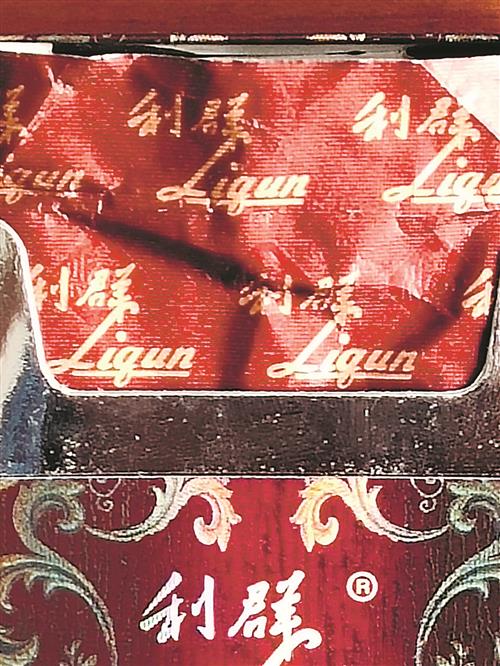 看顶部文字:真烟有钢印,且深浅不一,数字或字母印刷粗细有别,“利群”二字为暗朱红色,与底色融合度高;假烟无数字、字母组合钢印,“利群”二字为亮红色,且印刷死板、浮于表面。