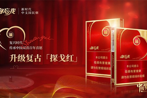 双喜(勿忘我)为中支烟,产品零售指导价200元/条,包装设计以红金搭配将「喜」文...