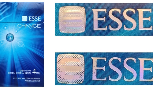 真品卷烟银色烫金字母“E”的笔画立体饱满,有明显中间凸边缘平的视觉效果。银色圆点...