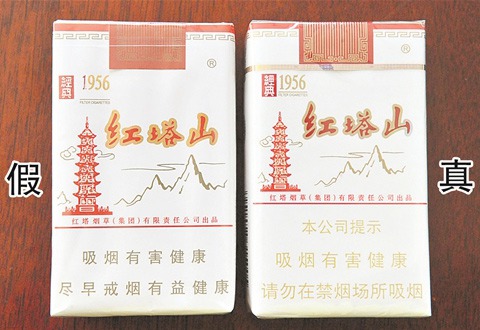 商标纸正面印刷工艺差异对比:真烟商标纸采用凹印印刷,两种颜色交界边缘有锯齿痕迹,...
