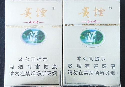 真烟“贵烟”二字有浮雕效果,颜色均匀,瀑布图案颜色自然,边缘颜色由深入浅,拉带字...