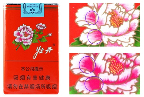 小盒正面商标纸印刷工艺特征对比:真烟商标纸采用凹印印刷,主图案边缘烫金套印准确,...