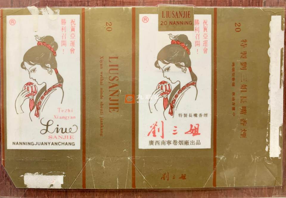 1986年,广西南宁卷烟厂出品了“刘三姐”牌烟标。该烟标主、副版主图案一致,都是刘三姐的形象。红绳盘发的刘三姐,身材纤细,穿着壮族传统服饰,衣襟上彩带色泽艳丽,美得清新脱俗。她手持绣球,巧笑嫣然,明媚动人。