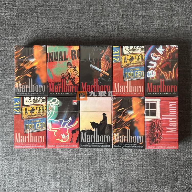 国家地理限定万宝路,上面5包是日本的,下面5包是德国的,都是04年左右出的限定,德国那一组是今年刚玩的时候购买的,找了接近2个月才到手,这个国家地理限定好多个国家都出了,上面10包都是不成套的,只是一组,后面要配成一大套的话几乎没什么可能,因为20年的东西了,实物非常少了。